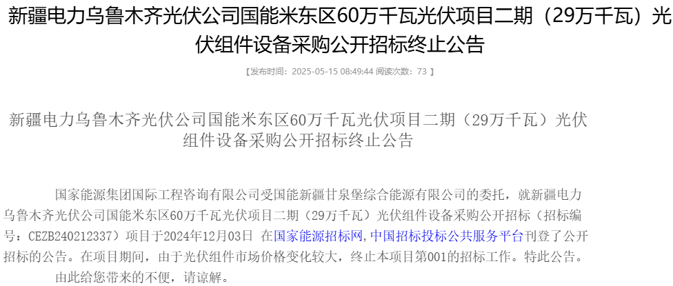 5月15日,新疆电力乌鲁木齐光伏公司国能米东区60万千瓦光伏项目二期(29万千瓦)光伏组件设备采购公开招标终止。